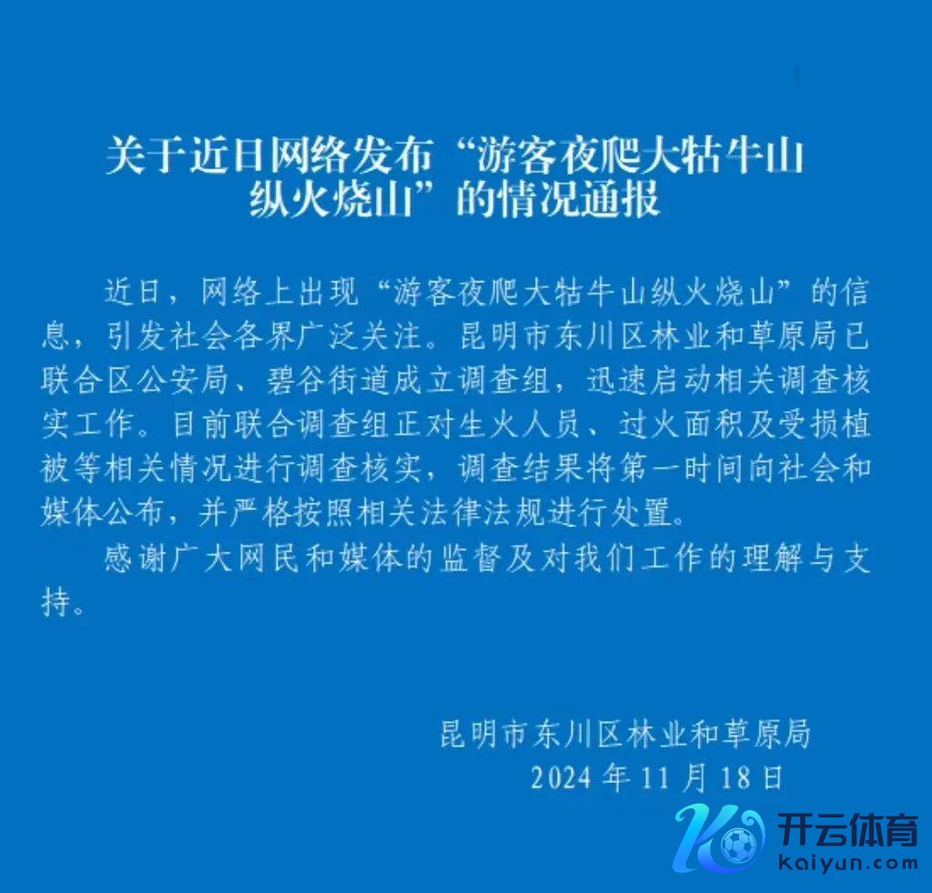 中新网11月19日电 据云南昆明东川区林业和草原局微信公众号音尘,近日,辘集上出现“旅客夜爬大牯牛山放火烧山”的信息,激勉社会各界厉害怜惜。昆明市东川区林业和草原局已积存区公安局、碧谷街谈成立看望组,飞速驱动联系看望核实职责。
