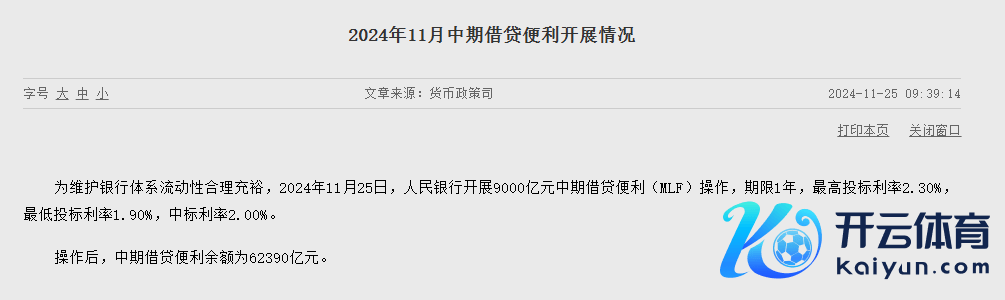 中国东谈主民银行网站音信,为防卫银行体系流动性合理充裕,2024年11月25日,东谈主民银行开展9000亿元中期假贷便利(MLF)操作,期限1年,最高投标利率2.30%,最低投标利率1.90%开云·kaiyun体育,中标利率2.00%。操作后,中期假贷便利余额为62390亿元。因本月MLF到期量为14500亿元,这次为缩量续作念。