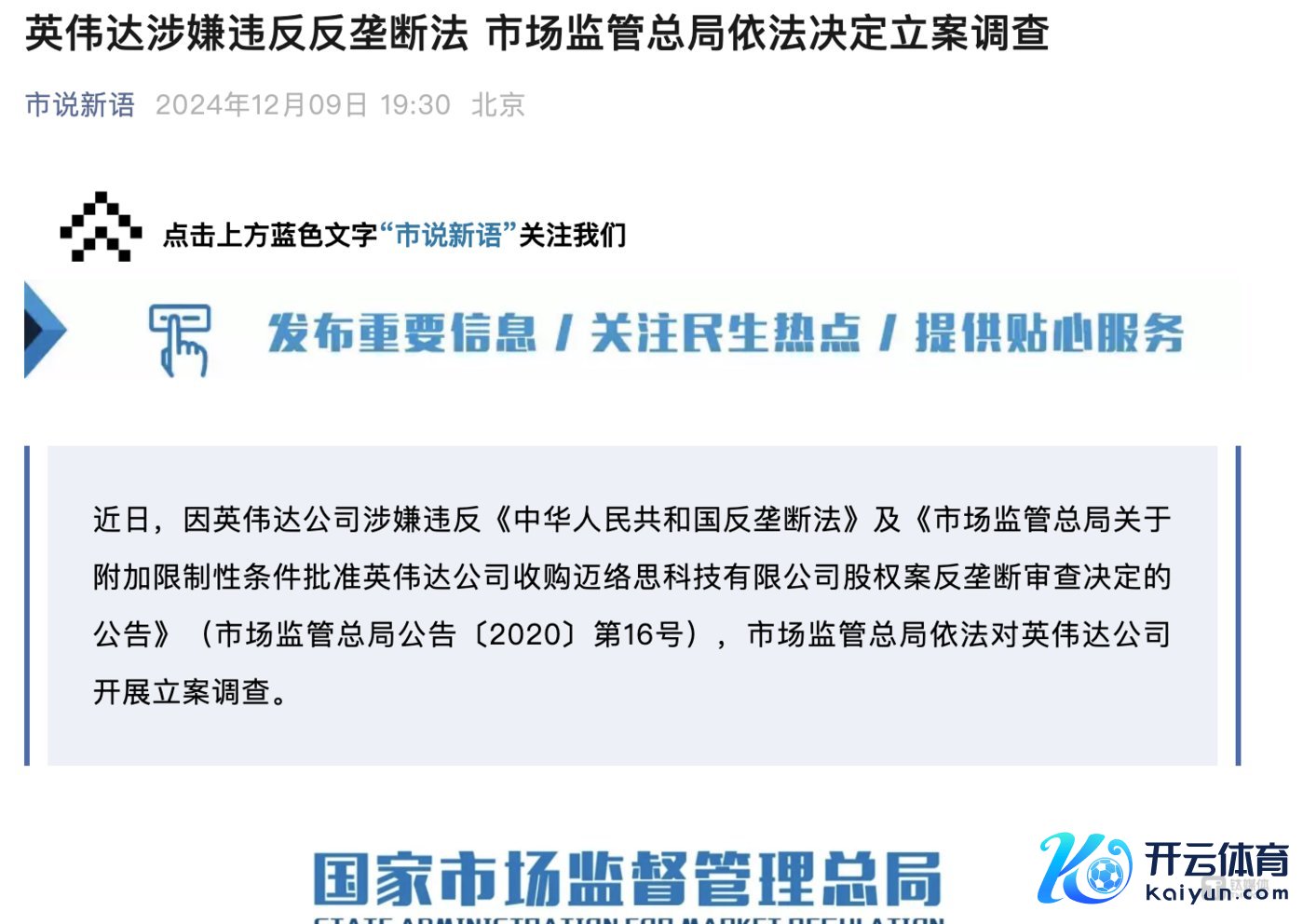 据央视新闻12月9日晚间报说念,近日,因英伟达公司涉嫌违犯《中华东说念主民共和国反把持法》及《商场监管总局对于附加限制性条件批准英伟达公司收购迈络技有限公司股权案反把持审查决定的公告》(商场监管总局公告〔2020〕第16号),商场监管总局照章对英伟达公司开展立案造访。