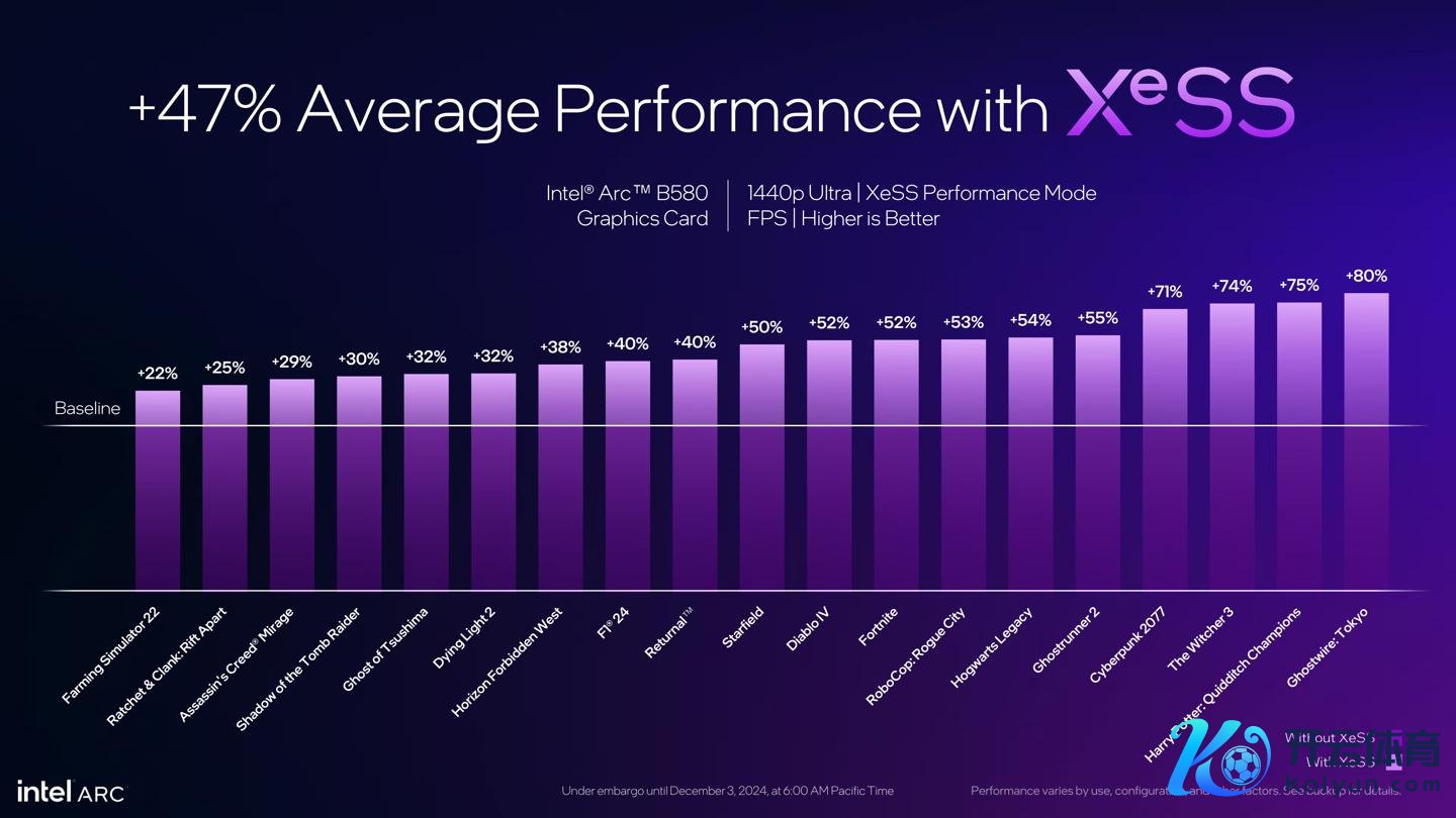 英特尔暗示,19 款游戏 1440P 超高画质下,XeSS 在性能情势下可提供平均 47% 的性能提高。