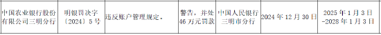 1月10日金融一线音讯,中国东谈主民银行三明市分行行政处罚决定信息公示表证明,中国农业银行股份有限公司三明分行因违背账户处理范例,被劝诫,并处46万元罚金。