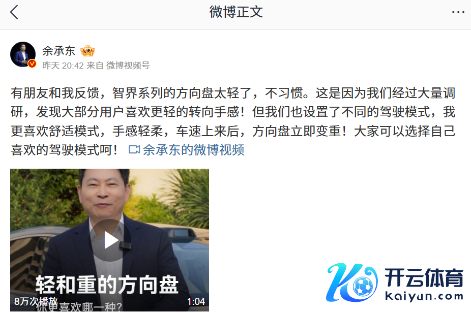 IT之家 1 月 15 日音问,华为常务董事、结尾 BG 董事长、智能汽车处罚决议 BU 董事长余承东昨日发布视频先容了智界系列汽车的标的盘盘算。他称标的盘太轻是因为经由调研,发现大部分用户可爱更轻的转向手感云开体育,同期设立了不同的驾驶模式,其中“心仪模式”手感存眷,在车速上来后,标的盘会立即变重。