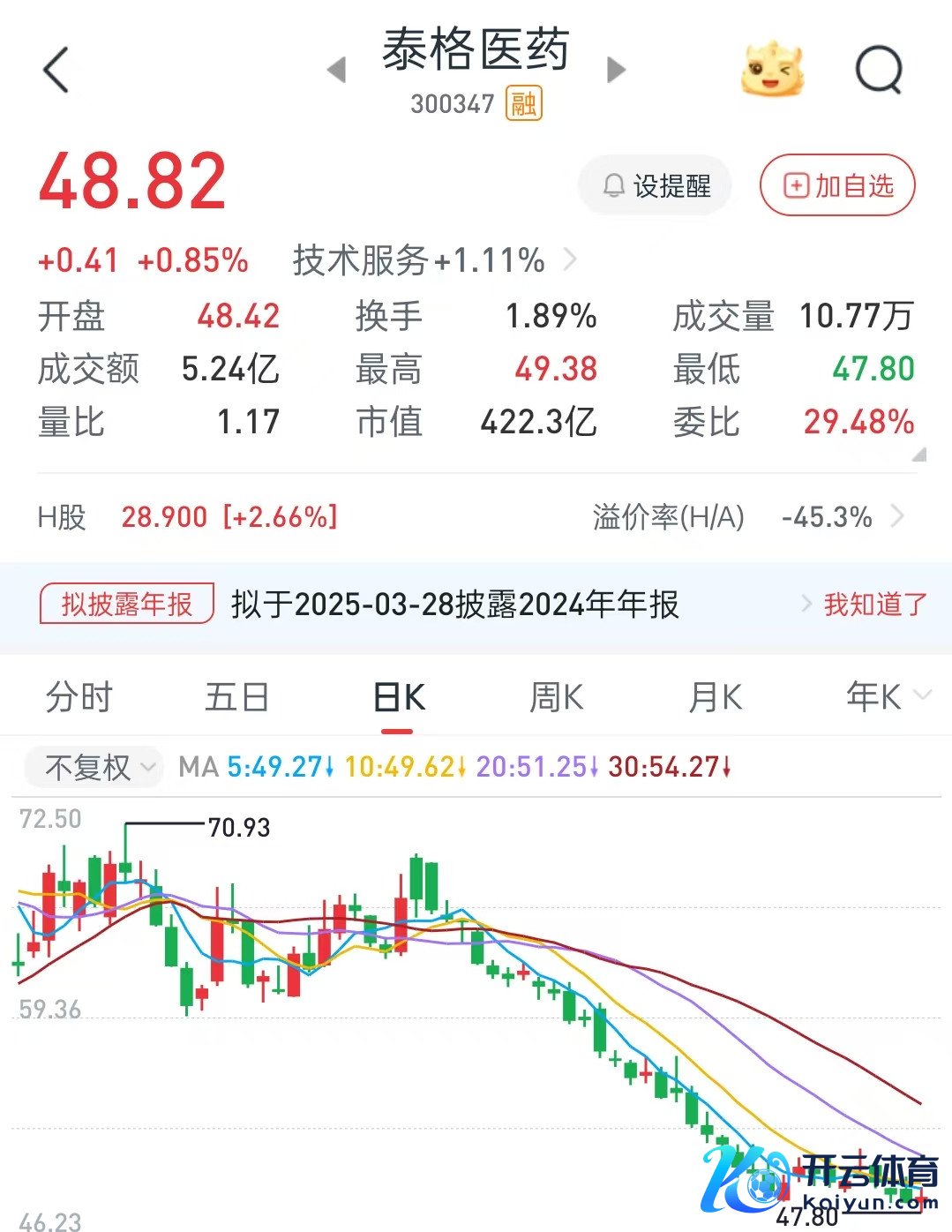 二级阛阓上,泰格医药昨日报收于48.82元/股,最新总市值422.3亿元,公司股价昨日下探出47.8元/股的阶段新低,这一价钱,较其2021年7月1日的历史高点(209.41元/股),跌幅已达77%。