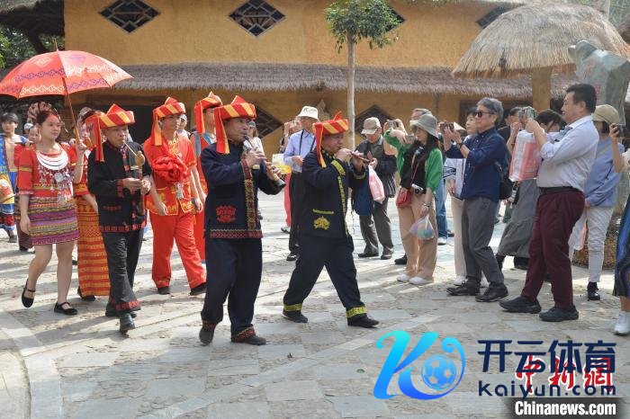 2月7日,在海南槟榔谷黎苗文化旅游区,日本旅业东说念主士唱起日本民歌《北国之春》,应和黎族祝酒歌。张月和摄